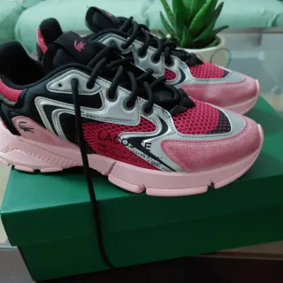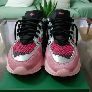 Zapatillas deportivas de la marca Lacoste en colores negro y rosa. - Diseño moderno y llamativo. - Detalle de logo en el lateral. - Cordones negros. - Suela gruesa y cómoda.