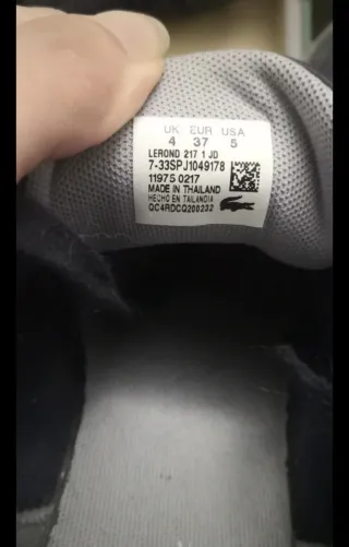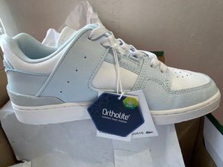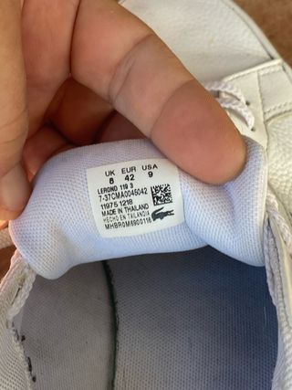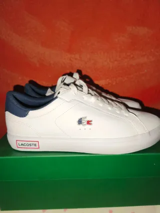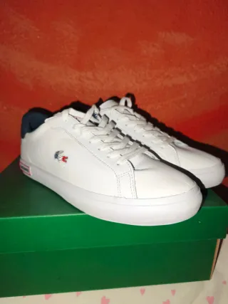 Un solo uso. Eran un regalo y me quedan pequeñas. Zapatillas de la marca Lacoste en color blanco con detalles en azul marino y rojo. - Diseño deportivo y casual. - Logo de Lacoste en el lateral y talón. - Cierre con cordones.