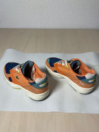 Zapatillas deportivas de la marca Lacoste con un diseño moderno y llamativo. - Combinación de colores naranja y azul. - Detalle del logo de Lacoste en el lateral.