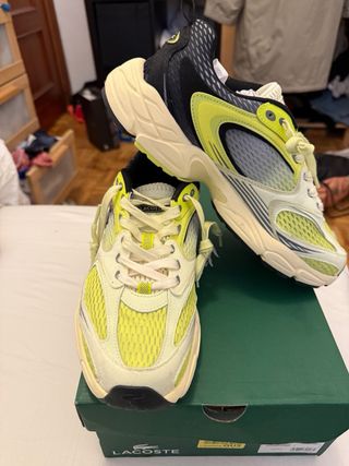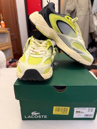 Zapatillas de estilo retro running de la marca Lacoste. nuevas sin estrenar compradas en corte inglés, vendo porque se me pasó la fecha de cambio - Diseño moderno con detalles en amarillo y negro. - Suela de goma para mayor agarre. - Materiales textiles y sintéticos.
