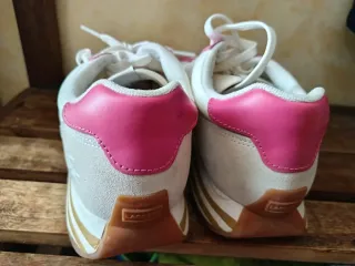 Zapatillas deportivas de mujer con un diseño moderno y detalles en rosa. - Combinación de materiales en el exterior. - Detalle de logo en el lateral. - Suela con líneas de color. Una tiene una pequeña mancha en la parte delantera que lavándose seguramente se quite