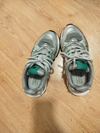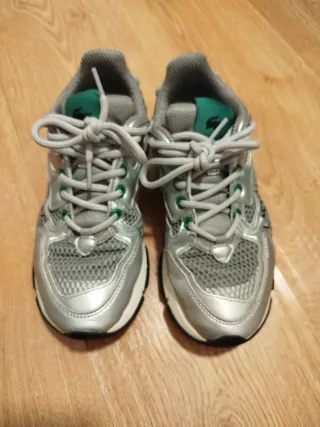 Se venden zapatillas deportivas, con un diseño moderno y detalles llamativos. - Combinación de colores plateado y blanco. - Materiales de malla y sintéticos. - Cierre con cordones. Nuevas