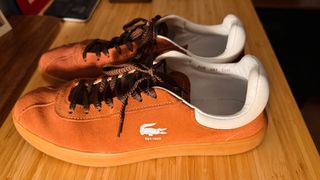 Zapatillas de ante de la marca Lacoste en tonos marrones y naranjas. Perfectas para un estilo casual. - Diseño de ante. - Cordones marrones. - Suela de goma. - Logo del cocodrilo bordado. Usadas tres veces