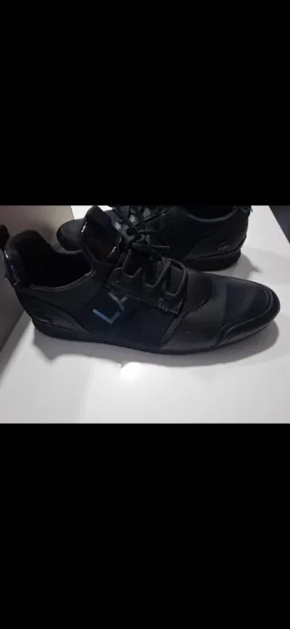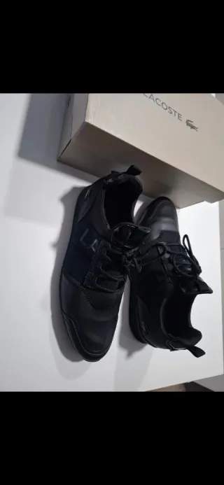 Zapatillas deportivas Lacoste en tonos negro y gris. Diseño moderno y cómodo. -VERDADERAS - Detalle de logo en la lengüeta. - Paneles de malla transpirable. - Cordones a juego. -zapatillas usadas muy bien conservadas -La caja la sigo teniendo -talla 45'5 puede servir Son cordenes ambi color -zapatillas reflextantes