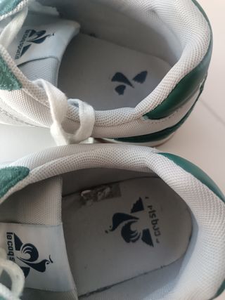 Se vende zapatillas marca Le Coq Sportif, talla 38 mujer. Estilo retro. Buen estado de suela y material exterior. En la ultima foto, se ve el detalle de una pieza plástica que se ha roto, por donde debe pasar el cordón, pero se puede hacer pasar por el otro ojal.