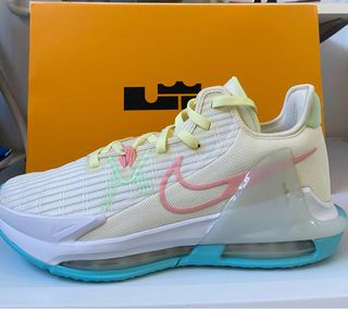 Zapatillas Nike LeBron con un diseño llamativo en tonos pastel. - Cierre de cordones. - Detalle de logo Swoosh en rosa. - Suela con amortiguación visible.