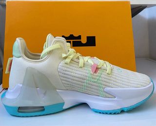 Zapatillas deportivas Nike Jordan LeBron con un diseño vibrante y llamativo. - Combinación de colores verde, rosa, azul y amarillo. - Cordones de color verde neón. - Swoosh de Nike en color verde lima. Son muy buscadas.
