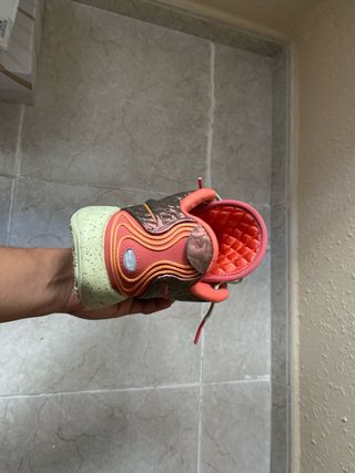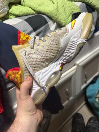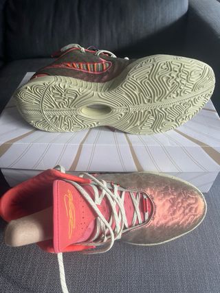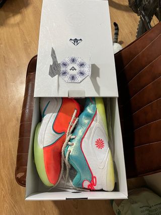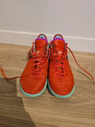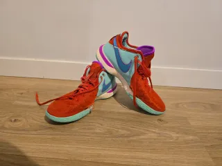 Zapatillas de baloncesto LeBron 19, edición limitada.Las he usado dos veces y no para hacer deporte, están nuevas, las vendo sin la caja. Son una edición limitada de colores y en piel 100%, una pasada como quedan puestas y lo cómodas que son.Talla 45, para pie de 29cm de largo. - Diseño multicolor con detalles en rojo y verde azulado. - Cordones rojos con detalles negros. - Suela con amortiguación visible. Son zapatillas de más de 350 euros, así que no regateo, el que las vea te aseguro que se las queda.