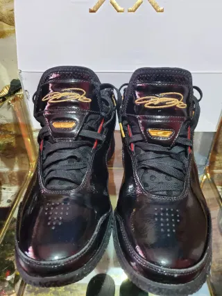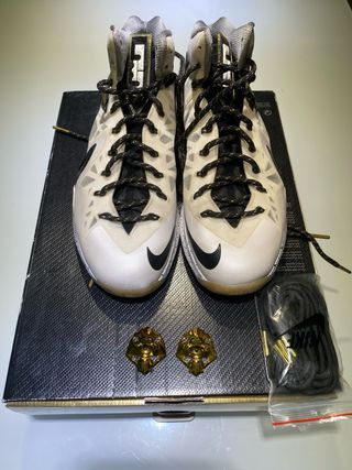 Zapatillas Nike LeBron 10 P.S. Elite+ en una combinación de colores blanco, dorado y negro.(TALLA 43) Incluyen los detalles en dorado para los cordones y cordones adicionales. También la caja original en la que venían, la caja no esta perfecta tiene algún toque en las esquinas y al ser negra la verdad que se nota. Usadas 2 veces y nunca para jugar, la verdad que me gustan pero hace 10 años que no me valen. - Modelo: LeBron 10 P.S. Elite+ - Talla: 43 EUR - Color: Blanco, Dorado, Negro