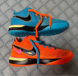 Zapatillas de baloncesto Nike con un diseño vibrante y moderno. - Combinación de colores azul y naranja. - Detalle de Swoosh en negro y detalles iridiscentes. - Suela con tecnología AIR ZOOM visible.