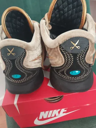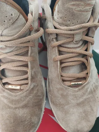 Zapatillas de baloncesto LeBron 21 con un diseño elegante. - Material exterior de terciopelo. - Cordones en tono beige. - Detalle metálico dorado en los cordones con el texto THE SHOP en una zapatilla y XXI en la otra. Verdaderas pero sin la caja original en el caso de duda tengo el ticket.