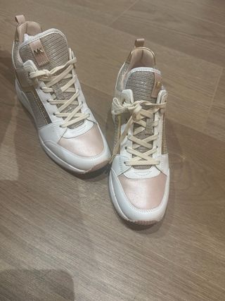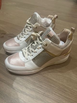 Zapatillas de diseño moderno con detalles brillantes. - Combinación de blanco, dorado y rosa pálido. - Cierre con cordones. - Logo de Michael Kors en la lengüeta. están como nuevas solo 2 puestas. originales y vendo con caja y todo