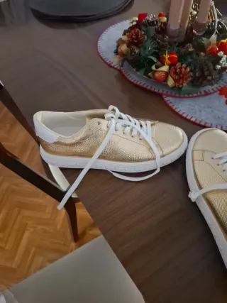 Zapatillas de diseño con un acabado brillante y detalles metálicos. Utilizadas un par de veces. Núm 35.