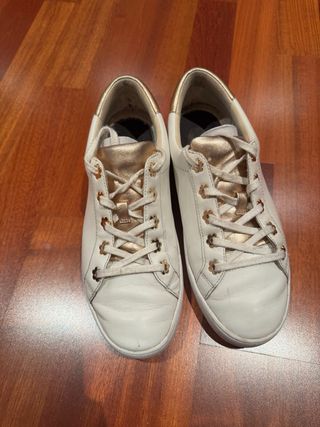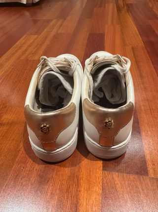 Zapatillas deportivas tipo tenis de la marca Michael Kors en blanco con detalles dorados. - Nuevas sin usar. - Piel. - Dan talla, como 1/2 número más (mi talla es 38 y me quedan grandes). Entrega en mano 28003
