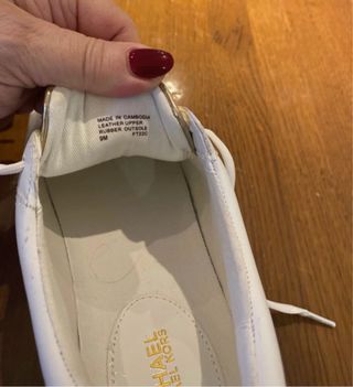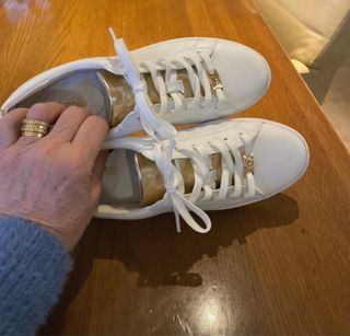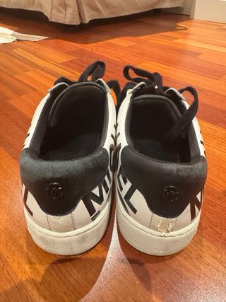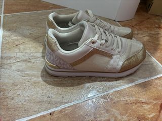 Zapatillas de la marca Michael Kors con un diseño moderno y elegante. - Combinación de blanco y detalles dorados. - Logo de la marca visible en la zapatilla. con pequeño picotazo en la puntera (se ve en la foto)