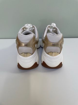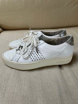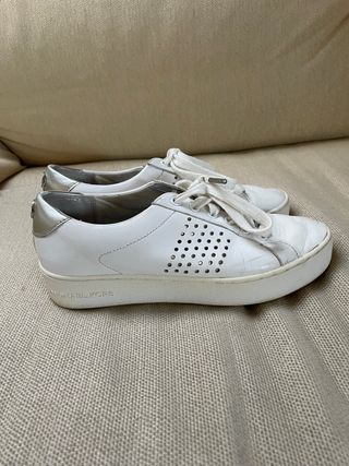 Playeras Michael Kors 37, están en muy buen estado, tiene alguan cosilla pero ni se nota ya que lo que más es por la parte de dentro inferior tiene del roce se le ha raspado un poco el color, pero nose se nota, y eso que la foto esta echo de cerca, lo demás nada, me le puesto 4 veces contadas se ve en la zuela, beis con hilos dorados. Me costaron 195€