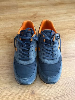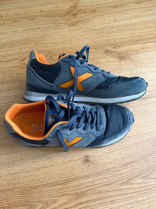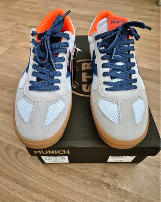 Zapatillas deportivas Munich en talla 43. Combinan tonos azules y naranjas para un estilo llamativo. - Cierre con cordones. - Detalle de logo en la lengüeta. - Diseño deportivo.