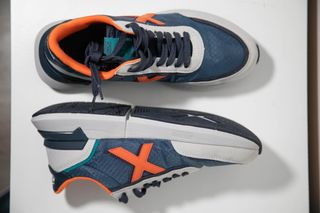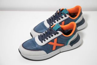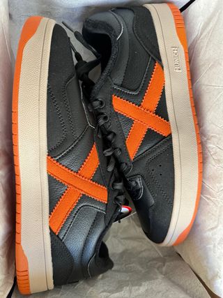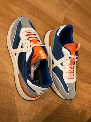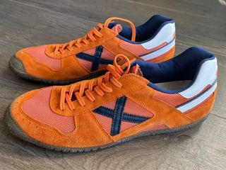 Zapatillas Munich de color naranja, talla 46. Se encuentran en excelente estado, como nuevas. - Diseño deportivo. - Detalle de la X característica de la marca en azul marino. - Combinación de ante y malla. - Suela de goma. - Forro interior azul marino. - Detalle blanco en el talón.