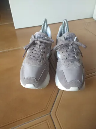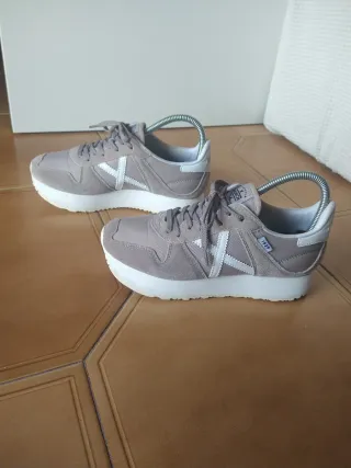 Zapatillas Munich de estilo casual. - Talla 41. - Combinación de colores marrón y gris. - Cierre con cordones. - Detalle de logo en la plantilla desperfecto puntera zapatilla como se aprecia en la última fotografía