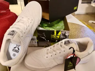 Bambas Munich ONE de hombre, talla 41, completamente nuevas. Modelo específico de fútbol sala/indoor, con parte superior sintética y rejilla que mejora la transpirabilidad, además de refuerzos de TPU en puntera y talón para mayor durabilidad y protección en los golpes. La mediasuela incorpora tecnología X-Lite para una buena amortiguación y estabilidad, y la suela de goma antideslizante está pensada para ofrecer agarre y flexibilidad en pistas interiores.