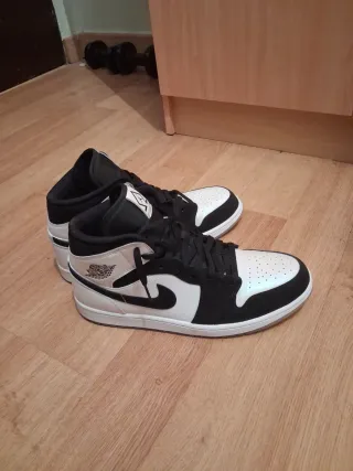 Zapatillas de la marca Jordan con un diseño llamativo y un acabado brillante. - Combinación de colores blanco y negro. - Detalle del logo de Jordan en el lateral. - Diseño de caña media.