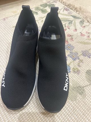 Zapatillas DKNY con un diseño moderno y elegante. - Parte superior de tejido negro. - Detalle metálico dorado en la suela. - Suela blanca de plataforma. PERFECTO ESTADO SIN PONER ,originales🩷