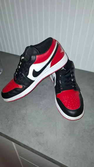 Zapatillas deportivas de la marca Jordan en color negro y rojo. - Diseño icónico. - Cordones negros. - Detalle del logo Jordan en blanco.