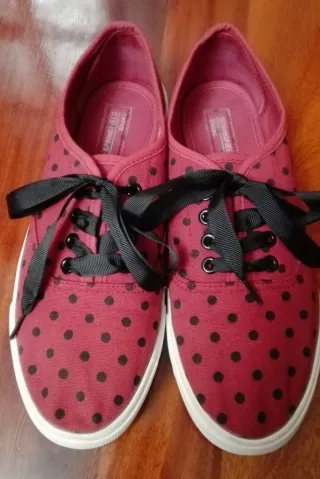 Zapatillas deportivas de la marca Springfield. Unas son de color granate con lunares negros y las otras son azul marino con pequeños corazones blancos. N°41. Buen estado. Precio individual. - Cierre de cordones. - Diseño original y llamativo.