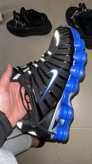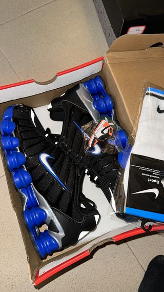 Zapatillas Nike Shox TL en color negro y azul. TALLAN TIRANDO A PEQUEÑO, MAS COMO UNA 40 - Diseño icónico con unidades Shox. - Detalles en color gris. - Incluye un par de calcetines deportivos Nike.