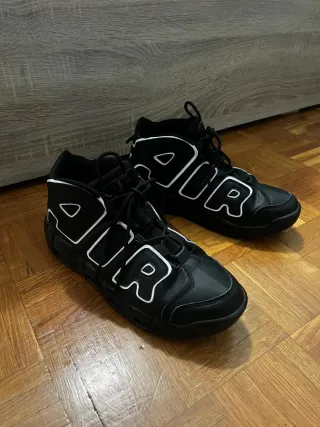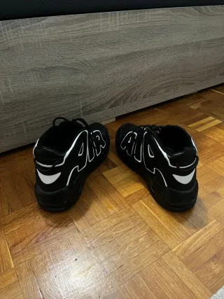 Zapatillas deportivas Nike Air More Uptemp color negro. Están poco usadas, la plantilla de una zapatilla esta un poco despegada de la parte de dentro (la del pie derecho) y también estan un poco gastadas en la parte de atras pero por dentro.