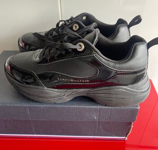 Zapatillas de la marca Tommy Hilfiger en color negro y talla 38. Diseño moderno y cómodo. - Acabado brillante. - Cierre con cordones. - Detalle del logo de la marca. - usadas un día. -se pueden ver y probar sin ningún compromiso.