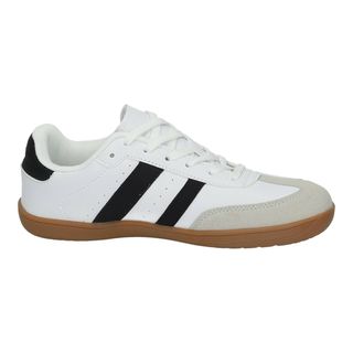 Zapatillas deportivas de la marca Demax, con un diseño moderno y cómodo. - Combinación de colores blanco y negro. - Suela de goma marrón. - Detalle de gamuza en la puntera. - Tres franjas laterales en contraste. - Tallas del 36 al 45.
