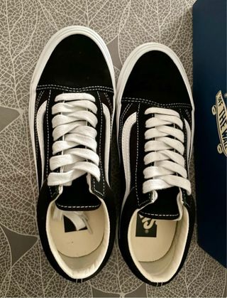 Vans Premium Old Skool, modelo especial que incluye paneles laterales más altos y con acabado brillante, además de cinta protectora de goma con los refuerzos Osnaburg originales de los 90. Están como nuevas, solo usadas una vez. Las vendo porque me quedan grandes. 💰 En la web cuestan 100€ nuevas, así que es una muy buena oportunidad