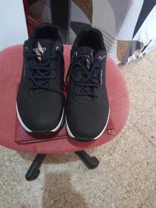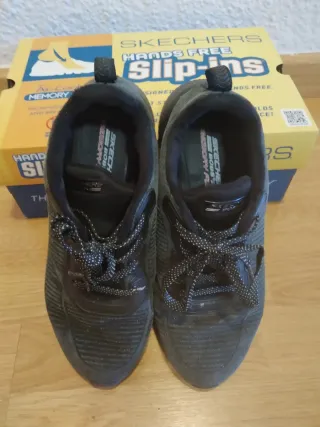 Zapatillas deportivas Skechers en talla 38. - Diseño moderno en color negro y blanco. - Suela con detalles en blanco y goma. - Cierre con cordones negros. - Detalle de perforaciones en la puntera.