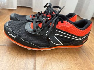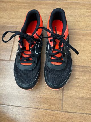 Zapatillas de atletismo con clavos, talla 38. Diseñadas para ofrecer un buen rendimiento en pista. - Combinación de colores negro y naranja. - Cierre con cordones negros.