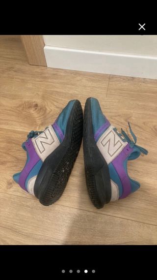Zapatillas deportivas New Balance con un diseño moderno y llamativo. - Combinación de colores morado y turquesa. - Detalle de la marca 'N' en los laterales. - Cordones a juego con el diseño.