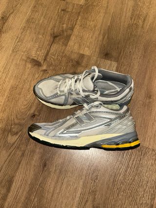 Zapatillas New Balance en excelente estado, originales. - Diseño deportivo y moderno. - Combinación de colores plata y blanco. - Detalles en amarillo en la suela.