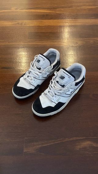 Zapato: New Balance 550 Color: Negro / Blanco Talla: EU 46.5 Se han usado ocasionalmente durante aproximadamente un año y muestran signos normales de uso. Hay una pequeña mancha en el interior de la lengüeta del zapato derecho, pero solo está en el interior y no se nota al llevarlas puestas. Por lo demás, están en muy buen estado: las plantillas originales están casi como nuevas, los cordones están impecables y siguen ofreciendo la comodidad de cuando eran nuevas. Hace unas semanas se les colocaron suelas originales nuevas, que conservan un dibujo profundo y muy poco desgaste, listas para seguir usándolas sin preocupaciones.