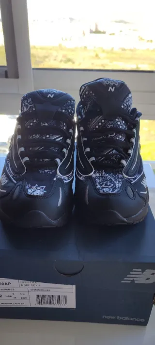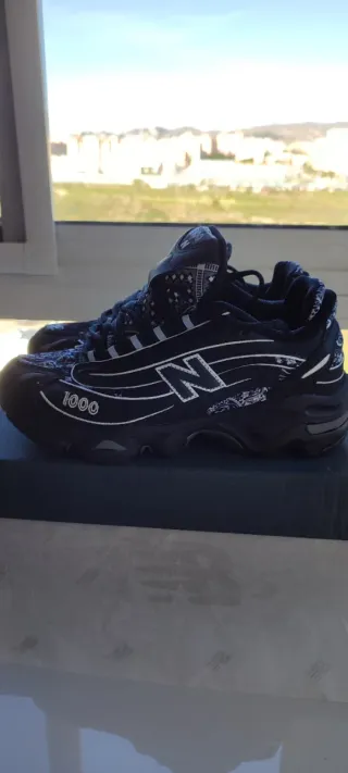 Zapatillas deportivas New Balance con un diseño moderno y llamativo. - Color principal negro con detalles en blanco. - Número de modelo 1000 visible en la zapatilla.