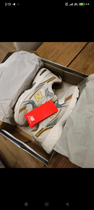 Zapatillas New Balance 530 con un diseño moderno y detalles en dorado y plateado. - Parte superior de malla transpirable. - Detalle de la N característica de la marca. - Suela de goma para mayor durabilidad.