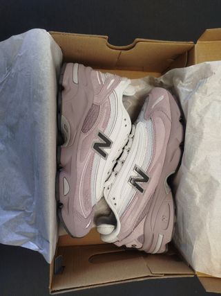 Zapatillas deportivas New Balance en talla 38. - Diseño moderno en tonos grises y rosas. - Detalle de la N en el lateral.