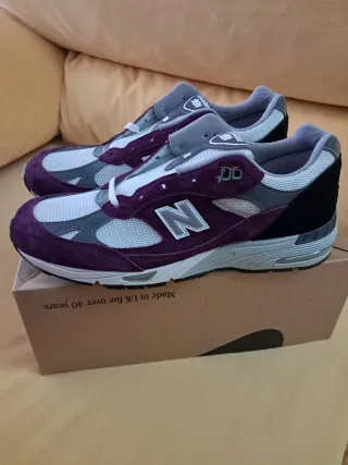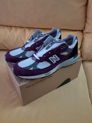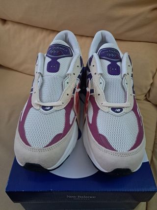 Zapatillas New Balance 990 con un diseño moderno y llamativo. - Combinación de colores beige y morado. - Detalle del logo 'N' en contraste. - Número '990' grabado en el lateral. Tallas 42.5 y 44