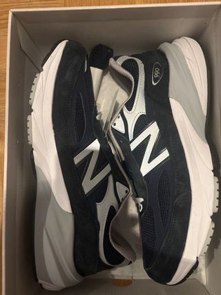 Zapatillas New Balance 990 v6, fabricadas en Estados Unidos. Combinan un diseño moderno con materiales de calidad. - Color azul marino y gris. - Detalle del logo 'N' en plateado. - Número '990' en el talón.