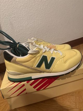 Zapatillas New Balance 996 fabricadas en EE. UU. con un diseño clásico y materiales de calidad. - Combinación de colores amarillo y verde. - Logo 'N' distintivo en contraste.