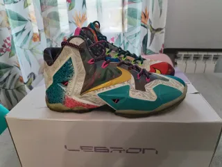 Zapatillas deportivas Nike LeBron James con un diseño retro y multicolor. - Estilo único con múltiples detalles gráficos. - Cordones llamativos en contraste. - Suela con diseño vibrante.