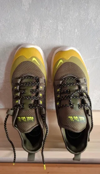 Zapatillas deportivas Nike con un diseño moderno y llamativo. - Combinación de colores verde oliva y amarillo. - Detalle de Just Do It. en la lengüeta. - Cordones con diseño. - Swoosh de Nike en el lateral.