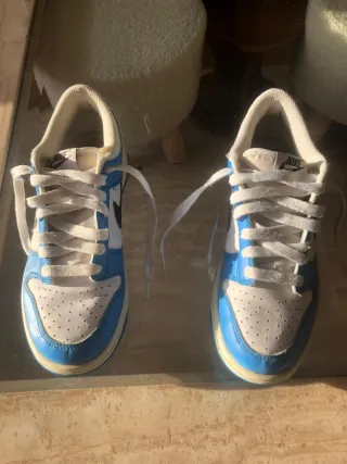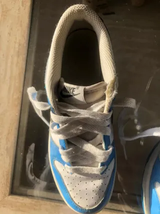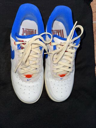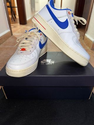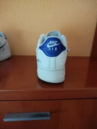 Zapatillas deportivas Nike Air Force 1 con detalles en azul. - Diseño clásico y urbano. - Combinación de blanco y azul. - Logo de Nike en el lateral y talón. Si quieres más fotos dilo por privado Está sin ticket ni caja porque lo tiré Tienen 2 meses y me las he puesto una vez