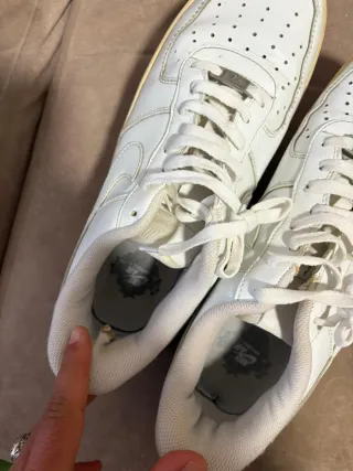 Zapatillas Nike Air Force 1 de cuero blanco con detalles en negro. Presentan un diseño clásico y versátil. - Exterior de cuero. - Swoosh lateral en negro. - Suela de goma. - Cierre de cordones. -SON ORIGINALES SOLO ESTÁN UN POCO DESGASTADAS PERO LE FALTAN CORDONES ESTA a 10€ PORQUE SON ORIGINALES I VALEN 40€