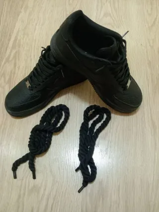 Zapatillas deportivas Nike Air Force 1 en color negro. Se incluyen cordones gruesos adicionales. Talla 42'5 - Modelo Air Force 1. - Color negro. - Cordones gruesos de repuesto.