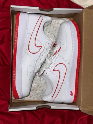 Zapatillas Nike Air Force 1 con detalles en rojo. - Diseño clásico y versátil. - Combinación de blanco y rojo. - Logo de Nike en el lateral.